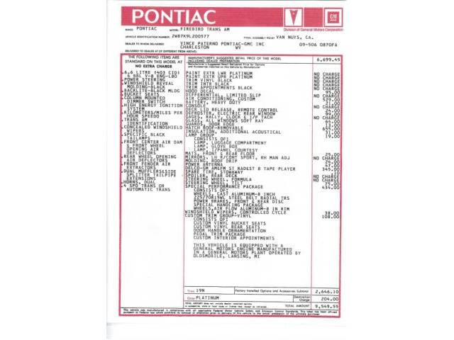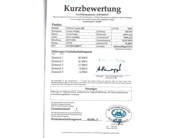 The delivery took place in October 1979 via the dealer Vince Paterno Pontiac/GMC in Charleston, West Virginia to the customer Mr. Jones.Mr. Jones sold the Trans Am with only 4000 miles in September 2012 to Mr. Hurley / Texas.I bought the vehicle in August 2022 with 5600 miles and took it from Texas via Munich to Mallorca.As you can see, I drove 5000 miles in 2.5 years. So what the previous owners have done in 43 years;-) For me, the Trans Am is a dailydriver. Runs, shifts like a 79 demonstration car.The first paint is in perfect condition.The car has never seen a car wash. I clean it only with car wipes and occasionally hand washing.The interior is also in mint condition.No cracks etc. The carpets have no scuffs. The first owner had the Trans Am completely cavity sealed. Nice to see on the A pillar/door hinge and hinges of the trunk lid.I renewed the 43-year-old shock absorbers in 2022. Speedometer/mileage confirmation Dec. 2011 = 4304 mls, speedometer/mileage confirmation May 2012 = 4334,mileage confirmation by Classic BMW in June 2013 = 4741 mls,mileage confirmation by Classic BMW in April 2017 = 5250 mls,mileage confirmation Classic Data Munich October 2021 = 5624 mls,mileage confirmation by Spanish MOT in June 2022 = 7968 mls. All receipts such as original vehicle invoice, window sticker, manual books, various service invoices, spare parts catalog, repair manual available. Classic Data replacement value October 2021 = 60.000.-€ Location Cala dor Tfl 0034/666 944 124