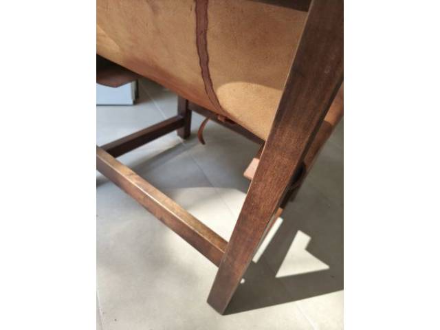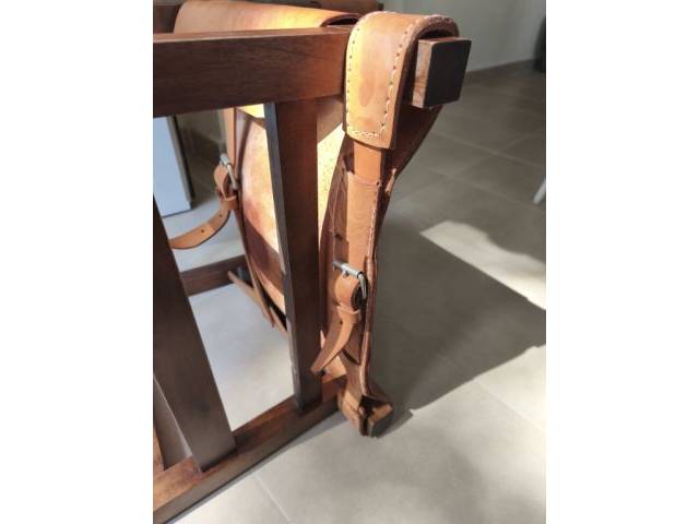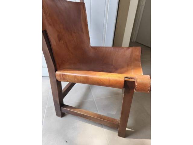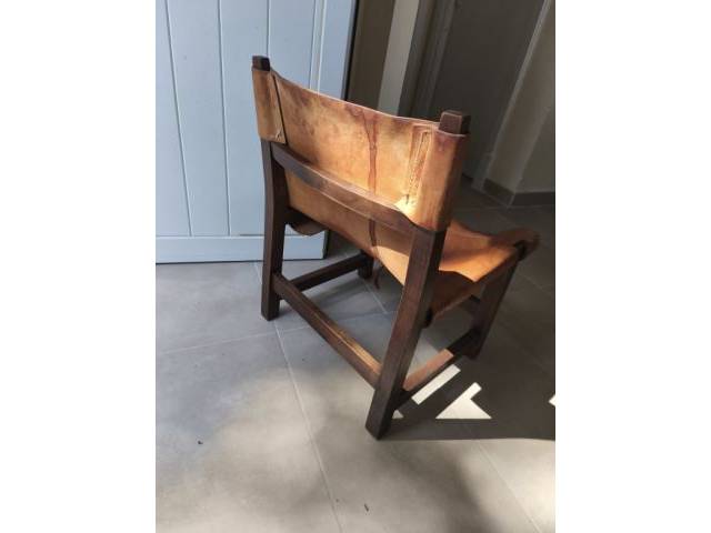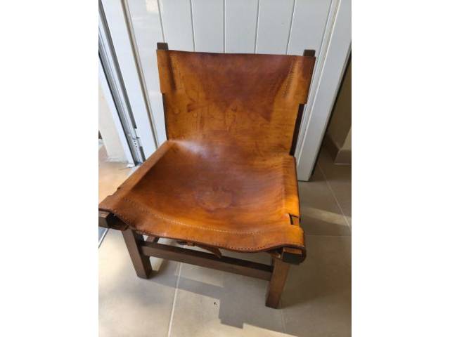 Paco Muñoz niedriger Jagdstuhl, Leder und Nussbaum. Holz in perfektem Zustand. Hergestellt in den 60er Jahren, in Spanien.