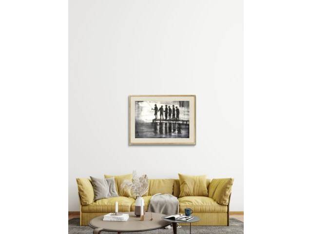 Scene of children fishing at sunset in the harbor l black and white with watercolors Daniel smith black lunar