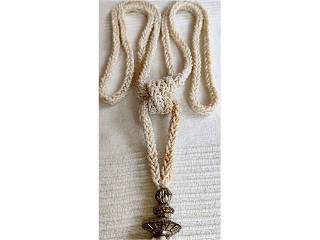 The sautoir consists of small, braided seed pearls and ends in an elegant tassel pendant with a decorated metal cap.