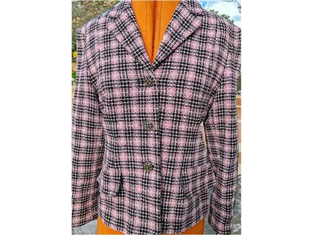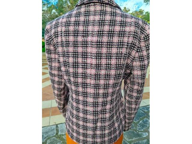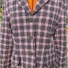 Design: The blazer features a classic design with a notched lapel, two buttons on the front and a continuous black lining. The check pattern combines pink and black tones.