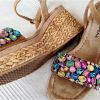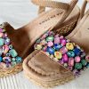 Details: Multicolored crystal and rhinestone embellishment on the front strap, braided jute sole in esparto look, adjustable ankle strap with buckle