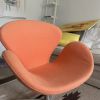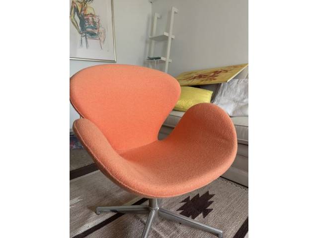 Comfortable swivel chairs in dark petrol and salmon colors, wool cover, both for €60, individually €40.