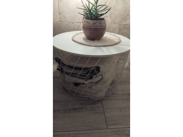 Selling a white metal storage basket with a wooden lid, practical to use as a side table...Diameter approx. 60 cm...