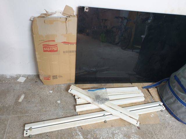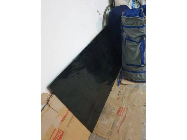 Black glass table, approx. 1,50× 80. Glass top in very good condition. White metal legs would need to be treated.