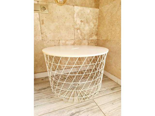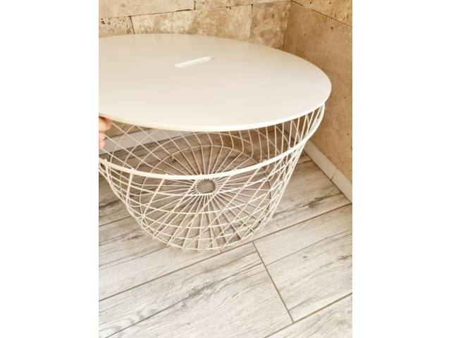 Selling a small side table, storage basket, wire basket made of metal with wooden lid, white, sturdy, offers nice storage space, very decorative, was only used for decoration and storing blankets, therefore in very good used condition, diameter 60 cm, height 40 cm...