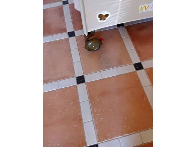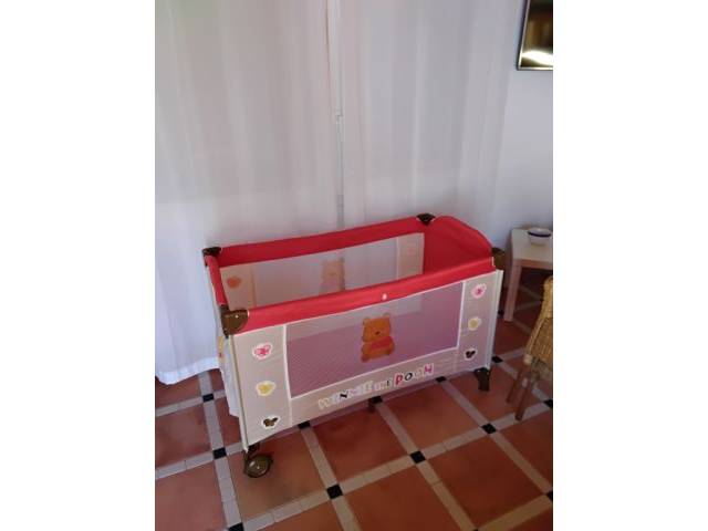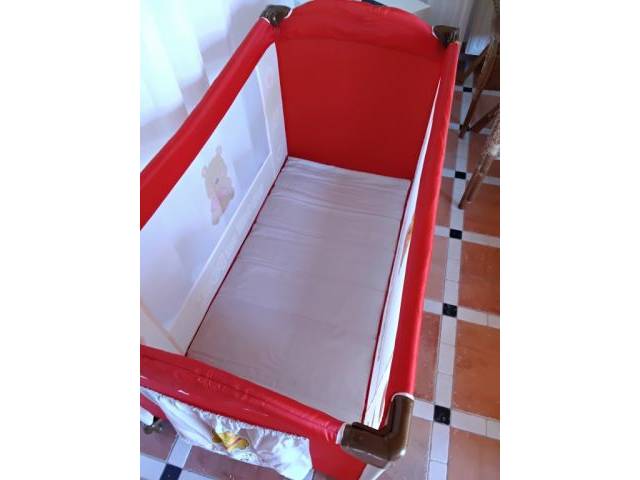 Very well-preserved children's travel cot "Winnie Pooh" with wheels and accessory pocket, color red, complete with mattress and storage bag, sleeping surface 120x60 cm, easy to assemble, pickup in Cala Murada.