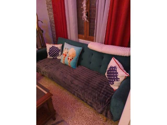 Almost as good as new couch set. 2m long. In green velvet. Can also be used as a bed. I have 2 sofas and 2 poufs. To be given away together for 500 €