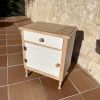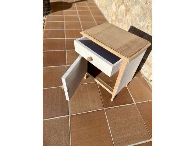 I am selling a decorative bedside table. White lacquered with natural wood. Dimensions approx. 46x31x57 cm. Unique piece.