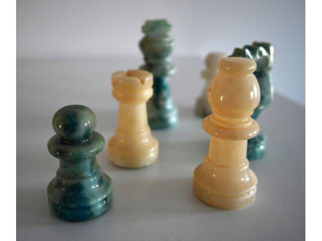 A beautiful chess set made of white / light blue-green alabaster (similar appearance to marble) from Volterra/Italy with a white table (wood, matte white lacquer), with additional pieces for the game of checkers, also made of alabaster. Table height 75 cm (standard table height), table top 48 x 40 cm, chessboard size 37 x 37 cm, piece height king = 7.5 cm.