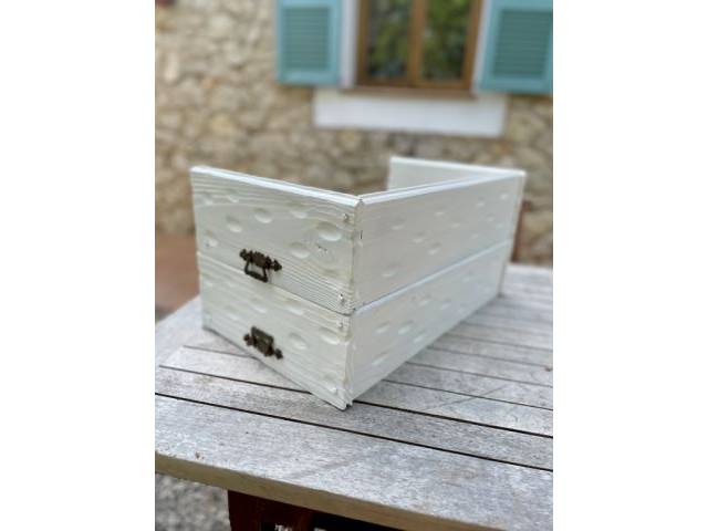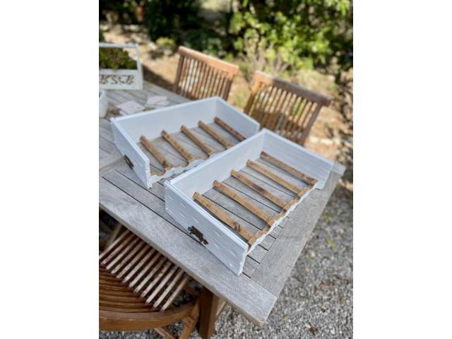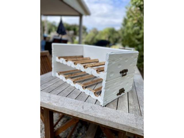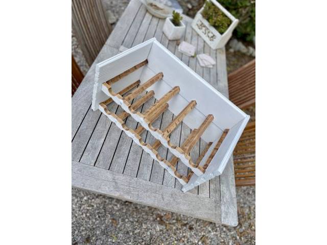 Selling two decorative wine racks for a total of 10 bottle capacity. Made of natural wood and matt white lacquered. Approx. 50x30x13/26 cm.