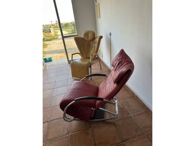 Offering 2 designer chairs in leather with an adjustable footrest.