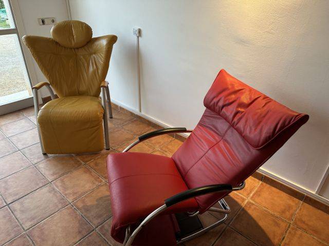On the yellow armchair the footrest can be raised and the red armchair can be converted completely into a recliner/bed.