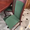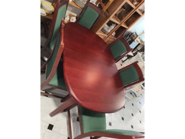 Sell an extendable dining table with 6 chairs. Dark wood , chairs with green upholstery . Price is complete