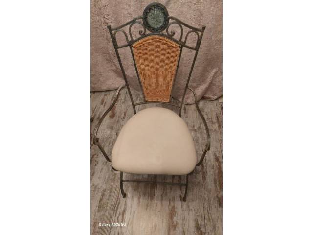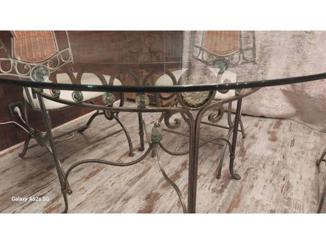 For sale: a high-quality round dining table (120 cm) including 6 matching chairs made of forged iron with glass elements.