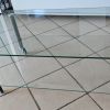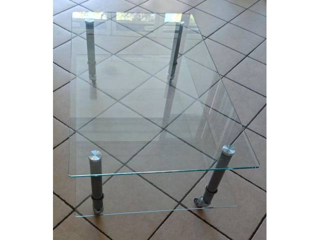 Elegant glass coffee table or similar on wheels.