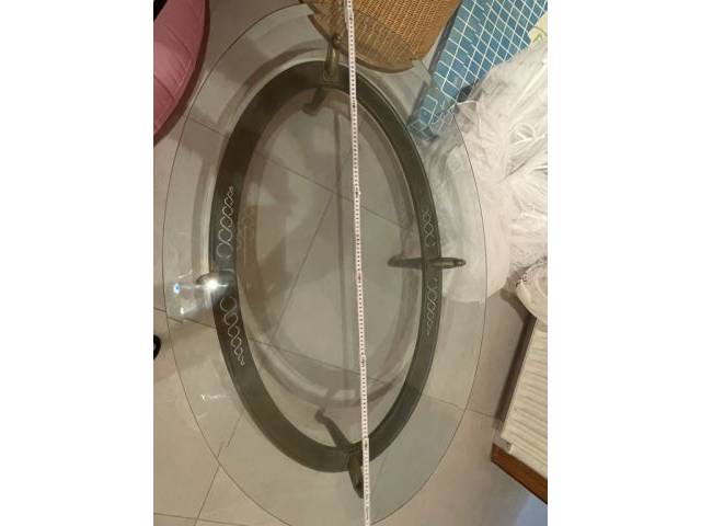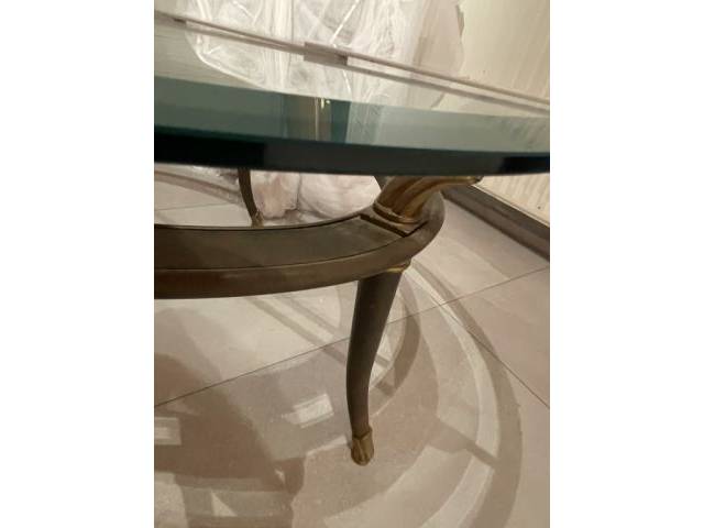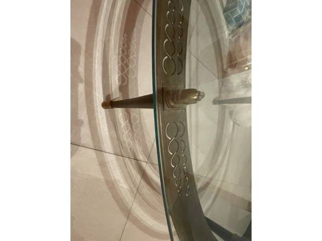 Oval glass table with fasting cut and metal base, possibly partly brass.