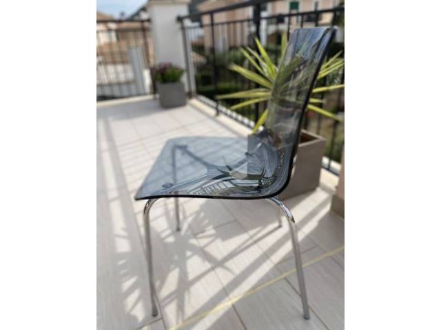 Selling 4 high-quality dining/kitchen chairs: 2x white/2x smoked glass. Material is easy to care for and washable. Legs in chrome. Chairs are in good condition with normal signs of use. No single-item sale and pickup only. €99 negotiable for the complete set.