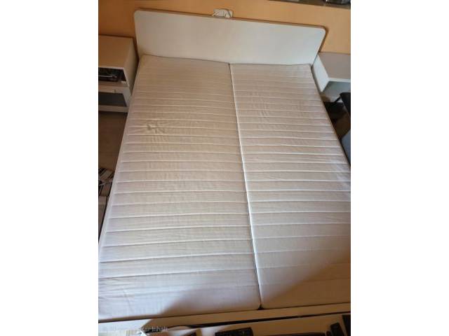 Ikea bed Askvoll 160×200cm incl. slatted frame and 2 mattresses (hardly used) plus two Ikea Birmnes nightstands, complete to give away.