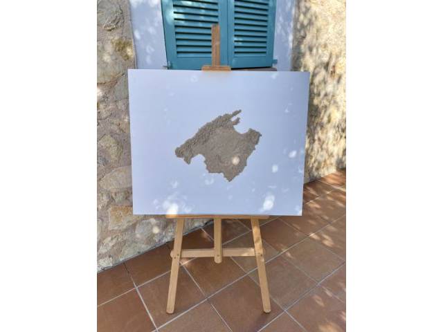 I'm selling an extraordinary Mallorca picture. The island is crafted as a sand relief on a large heavy wooden panel. Dimensions: approx. 40x30 cm. Unique piece.