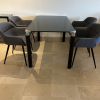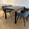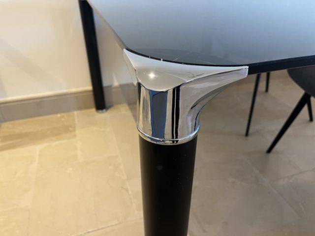 Table legs made of metal, black with silver accents at the top and bottom of the feet.