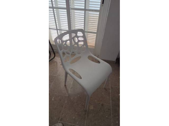 1 dining table with 4 chairs, white, chairs stackable, one table leg needs to be fixed. (original price €600), set €120, chairs individually €25 each,