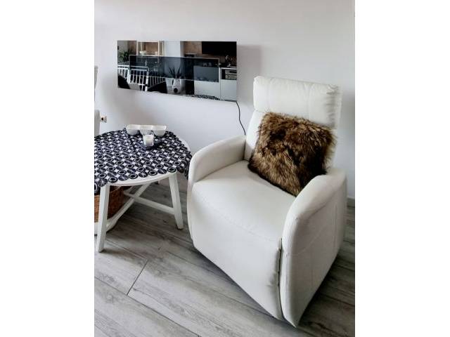 Selling a recliner, white, faux leather with adjustable headrest and footrest....very good used condition
