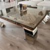The table is made of solid wood with an elegant glass top. The legs are made of sturdy iron and give the table a modern, exclusive design. Very sturdy and durable.