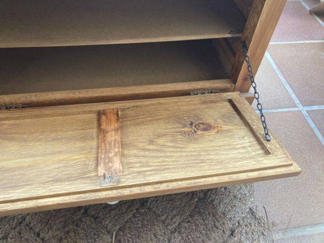 Nice wooden chest for storage; front opening with insert shelf; Dimensions: 76 cm long x 34.5 cm wide x 46 cm high