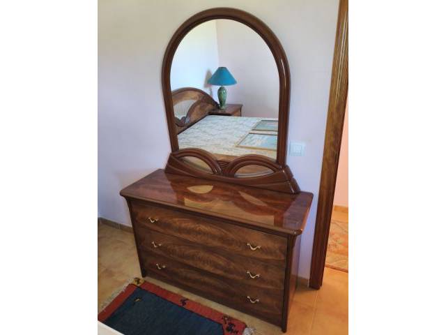 After buying an apartment, we are selling a very well cared for and unusual bedroom set because we want to furnish the apartment entirely in our own style. The elegant wooden surfaces are lacquered and high-gloss. The entire bed set is in good condition and shows only minor signs of use. Mirrors are elaborately integrated into the headboard. We measured approximately the following dimensions: bed 160x200, dresser 120x76x43 with mirror 180 cm high, bedside tables 60x50x43. Including slatted frame and mattress (damaged on one side). Pickup can be arranged from 09.03.2026 in Cala Millor. Parking and elevator available. Pet-free, non-smoking household. If you have any questions, please send a short message. The price is fixed; if no one is found at this price, the furniture will go to the Fundacion Deixalles. Best regards, Ralf.