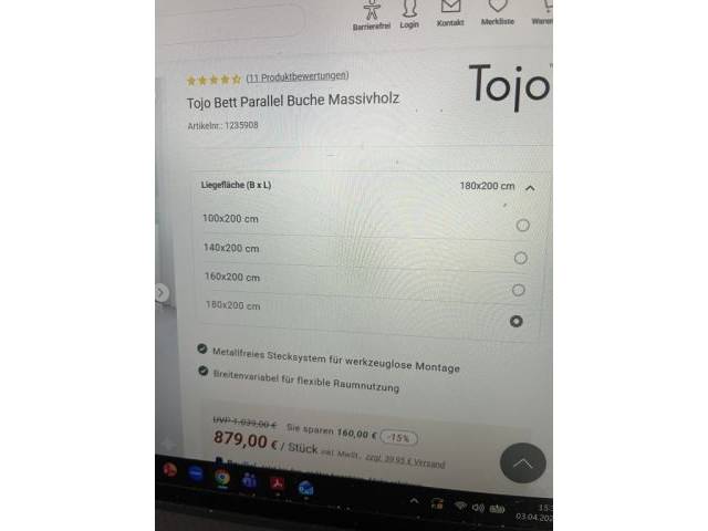 Metal-free bed — innovative plug-in system. Brand Tojo, solid beech wood. Originally packaged, for sale. Dimensions extended: 1.80 x 2.00 meters. Not extended: 1.00 x 2.00 meters.
