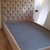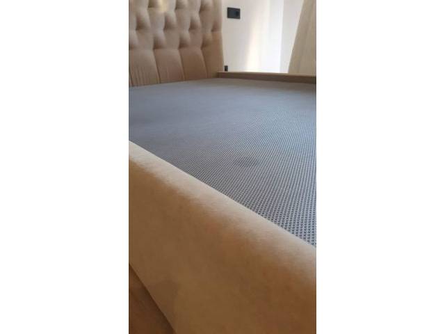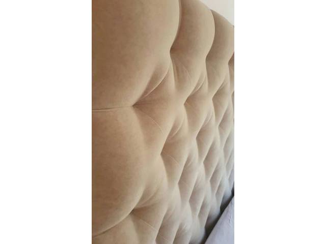 Designer bed from Portic Mueble in the color beige taupe with a special velvet embossing. Custom-made due to extra high headboard and anti-scratch fabric (in case of pets)