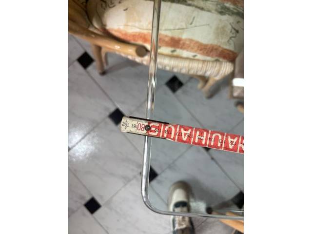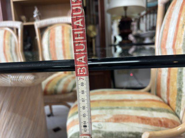 Elegant dining table with thick and beveled glass top, supported on a solid decorative base in classic style in cream and gold tones.