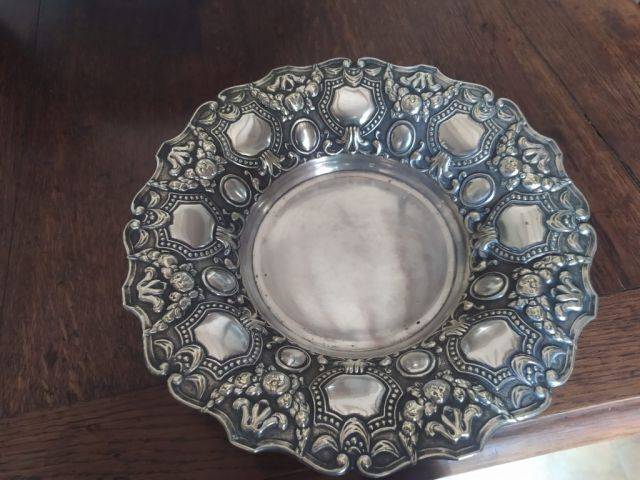 Antique decorative tray, made of nickel silver or metal, with an embossed and ornamented design