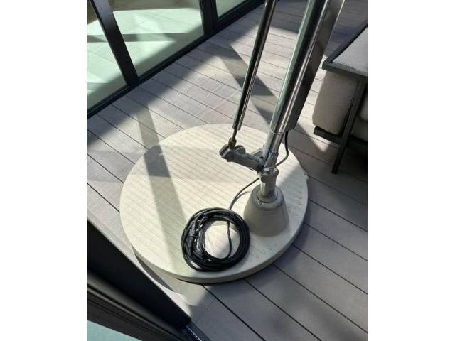 - Concrete base (very heavy, ~150 kg), aluminum arms, includes LED.