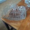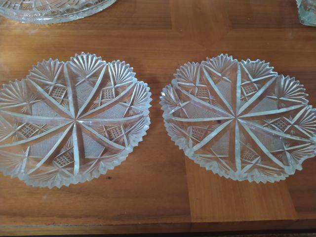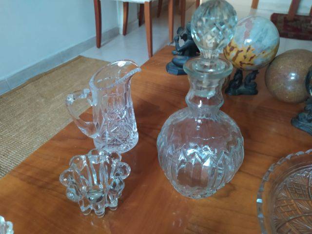 Cut glass jug (€30), Decanter (€20), 2 large cut glass bowls (€40/unit), tray (€20), 2 small plates (€5/unit) and candle holder (€5)