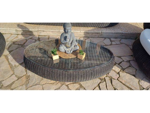 Large sofa + 2 armchairs + large side table and a small one, with all the cushions shown. (Without decorations)