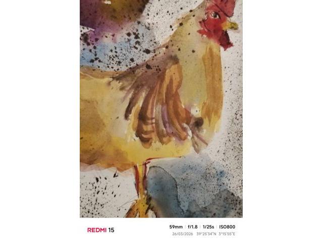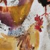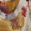 Vertical watercolor of roosters and hens with red tones and blue shadows, unique recent signed work