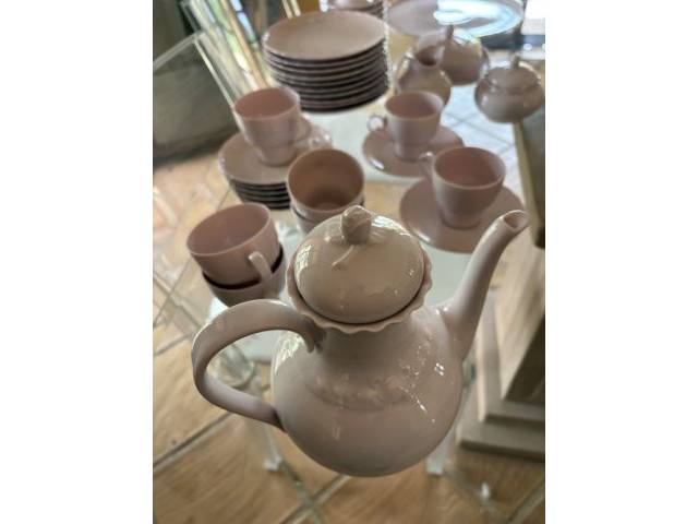 The breakfast set is complete for 6 people with egg cups, butter dish, milk jug, sugar bowl and coffee pot