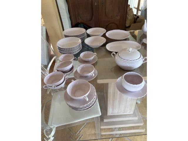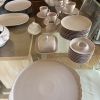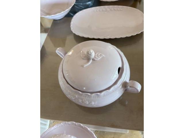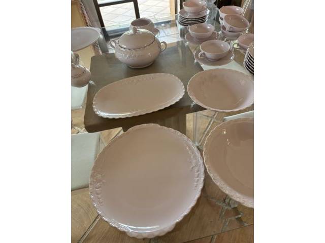 The dinnerware is complete for 8 people with soup cups, 3 bowls, 3 platters and a gravy boat