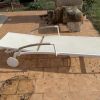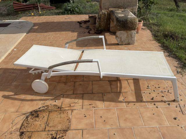 Used sun lounger with aluminum frame, adjustable backrest, durable synthetic fabric, movable on 2 wheels, offered cheaply for collection by buyer