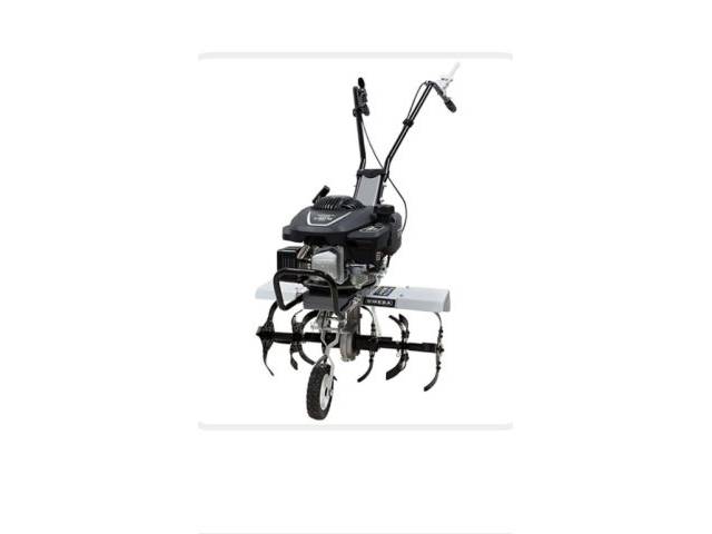 Rotary tiller for soil cultivation and agricultural use. 3.5-HP petrol engine. Supplied with 6 blades, with the two outer blades removable for tight spaces or narrow furrows.