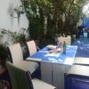 Patio table with 5 high-backed chairs that are covered with white slipcovers.