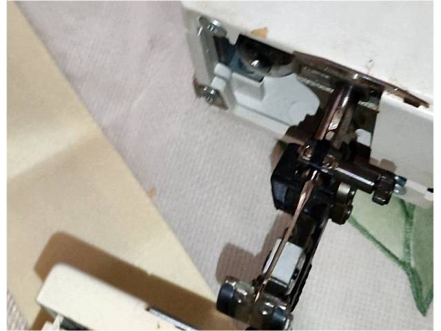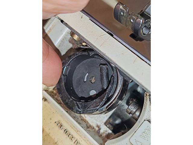 • Main defect: The bobbin carrier (plastic bobbin case holder) is broken and needs to be replaced (see detail photos). In addition, the hook assembly is misaligned.