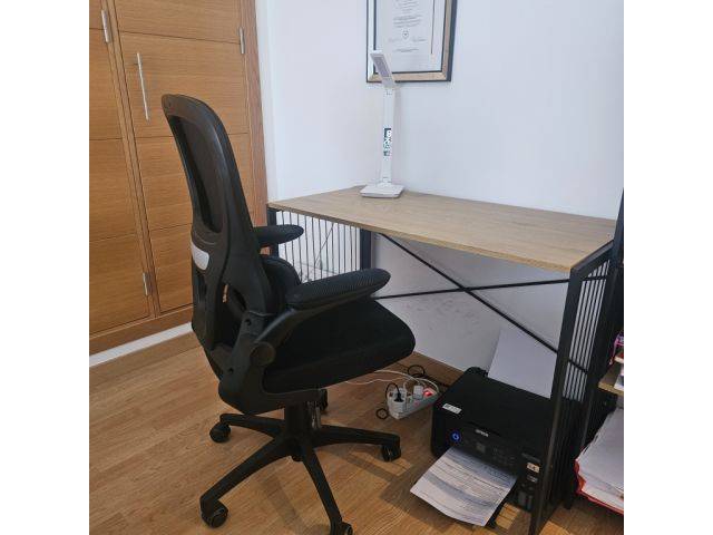 Selling a complete office set consisting of a foldable shelf, a foldable desk and an executive chair. Ideal for a home office, small office or study room.