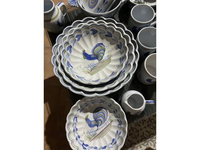 Tableware series from the Quimper faience pottery in France for sale. The tableware is from around 1980, like new and undamaged. Each piece is hand-painted and hand-signed. The Coq series is still in the pottery's current program. Viewable and to pick up in Capdepera. Price negotiable (VB).