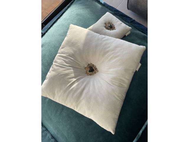 Very decorative velvet cushions in large (42 x 40 cm) and small (19 x 19 cm) in light blue, each with a metal medallion