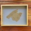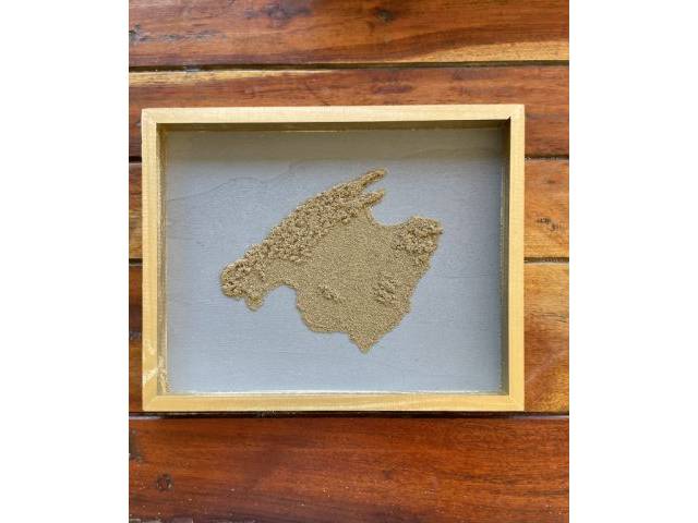 I am selling two Mallorca pictures. The island is worked as a sand relief (gold/natural/white) on a gray or white background with a wooden frame (gold/natural/white). Dimensions: approx. 30x24 cm. Each one is unique.