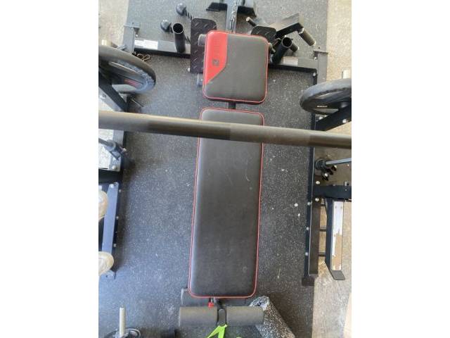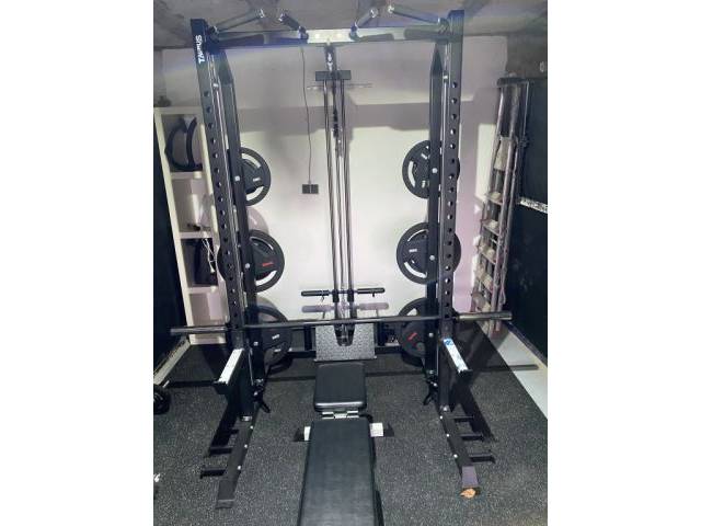 Very good condition 8 out of 10: Rack Smith Premium with cable pull, 1x bench, weights, accessories, gym floor mat (10 mm) and 1x yoga mat.