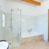 Upper floor: Living room, 1 bedroom with double bed and built-in wardrobe, 1 bathroom with bathtub and separate shower, 1 room with sofa bed.